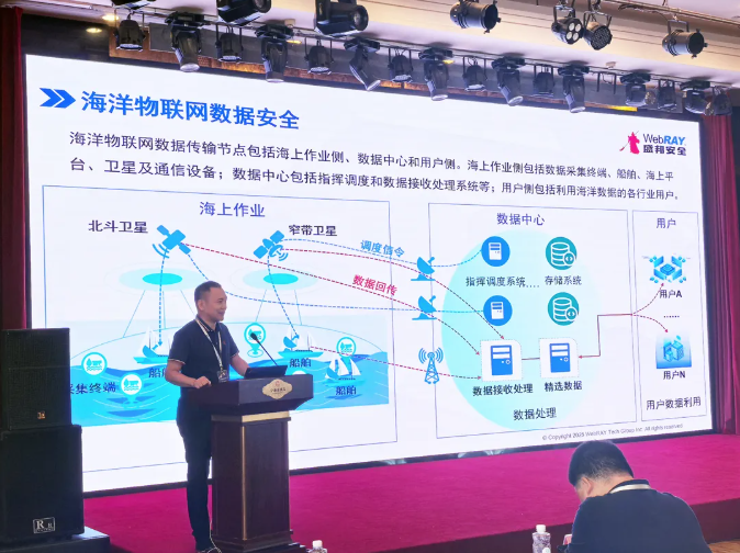 主论坛上,盛邦安全技术专家王晨发表《海洋物联网及船舶卫星通信安全防护》专题演讲。他指出,海洋物联网数据安全已成为智慧海洋建设的“底座工程”,需重点攻关低功耗、低延时的轻量级加密技术。王晨以两起伊朗油轮被攻击的事件为切入点,剖析了卫星通信被攻击后引发的连锁风险,强调“卫星通信安全就是船舶安全的命门”,分析了船舶网络安全风险,并提供覆盖安全检测、安全防护的全面解决方案。