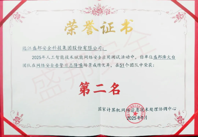 2025年9月15日,在国家网络安全宣传周网络安全技术高峰论坛主论坛上,中央网信办等十部委联合发布“2025年人工智能技术赋能网络安全应用测试”最终结果:盛邦安全烽火台实验室在“网络安全告警日志降噪”赛道从51支精英团队中脱颖而出,斩获全国第二名,为公司AI+安全融合创新版图再添重量级砝码。