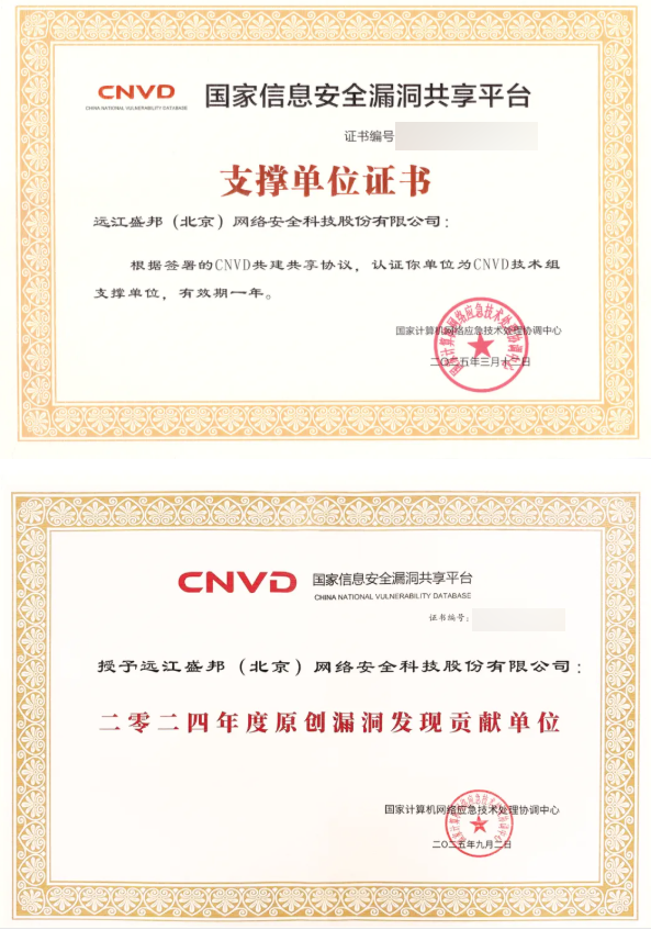 "2024年度原创漏洞发现贡献单位"荣誉则是对盛邦安全在漏洞挖掘和研究方面突出能力的肯定。该奖项表彰了公司在原创漏洞发现方面的卓越贡献,体现了盛邦安全在网络安全领域深厚的技术底蕴和创新能力。此次双奖加冕,标志着公司漏洞研究与应急响应能力再度获得国家级权威认可。