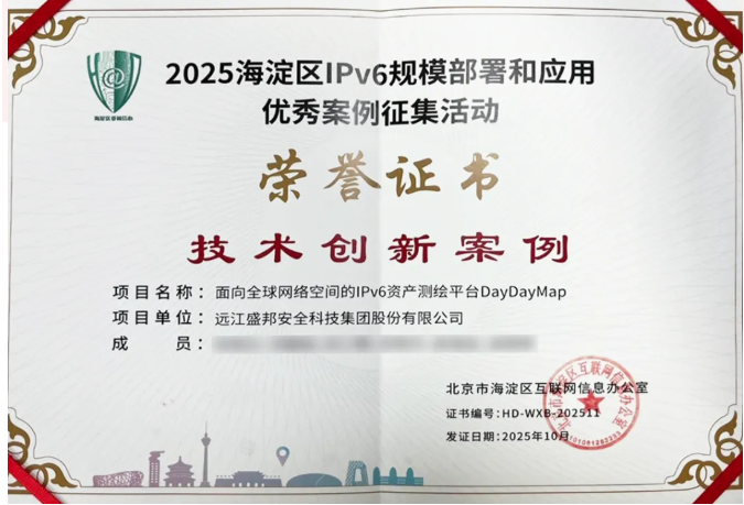 近日,2025年北京市海淀区IPv6规模部署和应用优秀案例征集活动圆满结束。活动历时近两个月,经过案例申报、初筛、专家评审、现场答辩与报审公示等多轮严格筛选,盛邦安全DayDayMap全球网络空间资产测绘平台,凭借其在IPv6网络安全领域的技术创新与实践成效,获得专家评审团的一致认可,从众多参赛案例中脱颖而出,成功入选网络安全技术创新案例,并于“第四届中国IPv6创新发展大会”中作为代表案例发布。