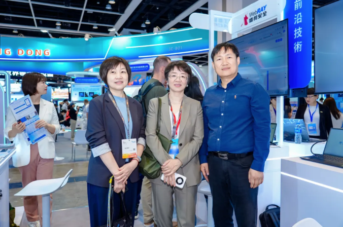 展会期间,盛邦安全国际事业部副总裁魏小强与海淀区外办港澳办主任陈鹏、香港贸易发展局北京办事处代表刘群进行了深度交流。魏小强详细介绍了公司在网络安全领域的技术积累与全球化业务布局,并明确表达了借助香港平台拓展国际市场、积极接轨国际规则的战略决心。双方围绕内地科技企业出海路径等议题展开务实探讨,此次交流也让盛邦安全切实感受到京港两地政府部门对科技企业出海的高度关注与有力支持。