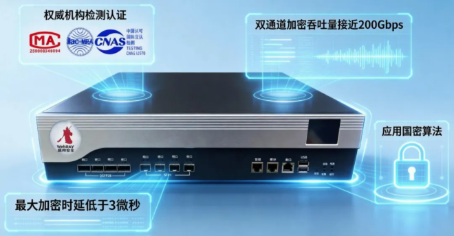 相关性能此前经过了中国信通院泰尔实验室的权威检测。检验结果显示,整机实现200G比特每秒(bps)明通吞吐、195Gbps加密吞吐,单口加密速率达97.68Gbps,吞吐量较传统方案提升5倍,加密时延平均低于3微秒,64字节小包时延仅1.128微秒,较传统方案性能提升300倍,助力实现“无感”安全防护。