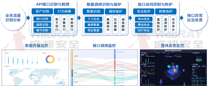 针对此类事件,盛邦安全推出面向短信业务平台的API安全治理方案,结合API安全当前面临的典型问题,覆盖API学习、API画像、攻击防护、权限保护、API审计和应急响应等各个阶段,以业务风险识别与防护控制为核心目标,通过对业务流量的识别分析来梳理API接口,在此基础上通过数据建模、行为建模和算法分析等技术,实现API接口识别与梳理、数据调用识别与保护、接口访问安全控制及审计等安全能力,从而实现面向API接口全生命周期的安全监测与治理。