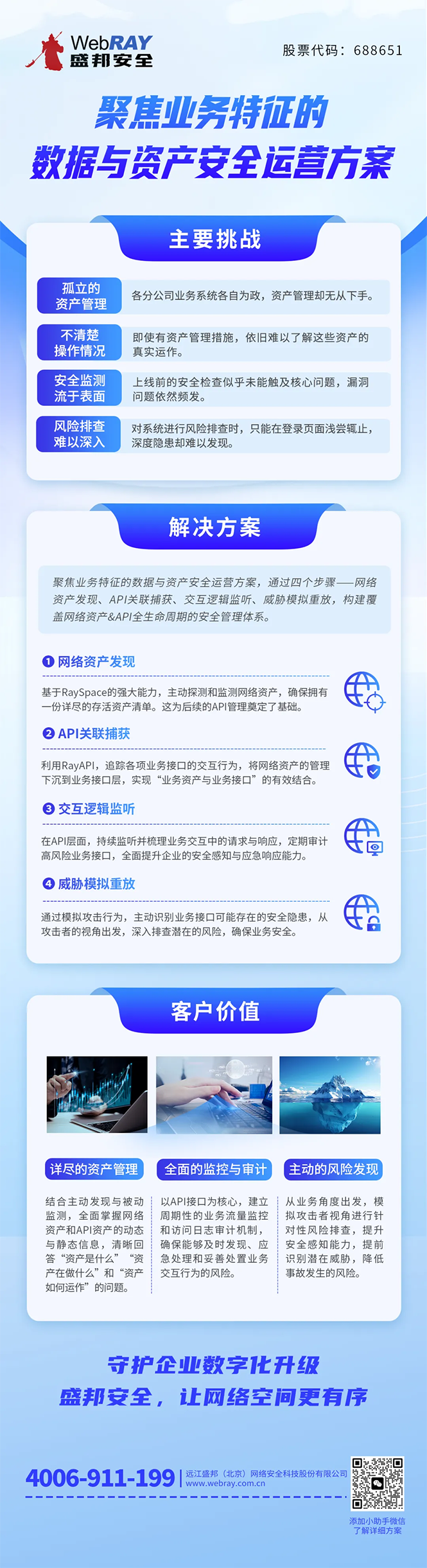 网络安全不仅是对已发生事件的被动反应,更应成为对未来威胁的主动防范。盛邦安全以创新技术为矛,以丰富的实践为盾,为企业的数字化升级保驾护航,让每个业务都能在安全的环境中茁壮成长。