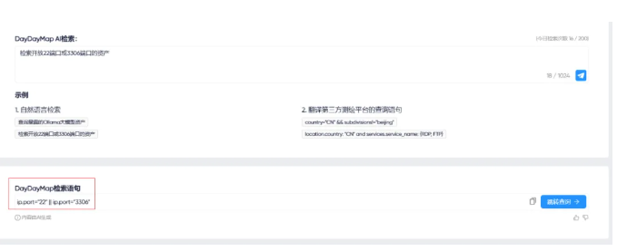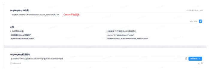 过往,使用传统测绘工具,用户得先苦练 “语法功底”,熟练掌握诸如 port:21、service=ftp之类的语法规则,并且不同平台的语法大相径庭,用户在切换平台时,还得重新适应,耗费大量精力学习。DayDayMap的自然语言检索功能彻底颠覆了这一逻辑。你只需用最日常的语言,输入“端口为21或服务为FTP的资产”,瞬间,AI引擎便能精准领会你你的意图,会你生成专业、精准的语法【ip.port=21"||.service="ftp"】,轻松解锁亿级数据,让复杂检索变得如此简单,就像日常聊天一样轻松。