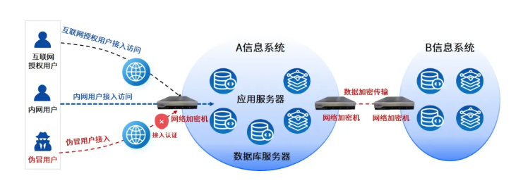 网络加密机是部署在网络节点之间,对传输数据进行硬件级信道加密/解密的专业安全设备。它构建了网络通信的“加密隧道”,确保数据在传输过程中即使被截获也无法破译。除了数据传输加密,网络加密机还可以实现通信时基于PKI体系的高强度身份认证以及基于哈希算法的数据完整性保护,防止通信身份冒用和数据篡改。