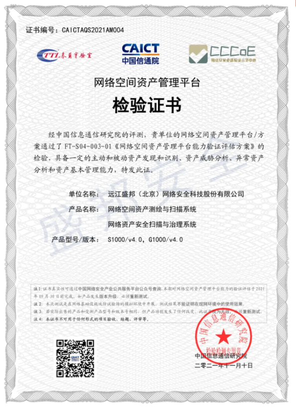 近日,由中国信通院组织开展的“先进网络安全能力验证评估计划”第七期-网络空间资产管理平台能力评测结果出炉,盛邦安全网络空间资产测绘与扫描系统(RaySpace)和网络资产安全扫描与治理系统(RayGate)顺利通过检验评估并取得认证,标志着盛邦安全网络空间资产测绘与治理系列产品获得中国信通院认可。