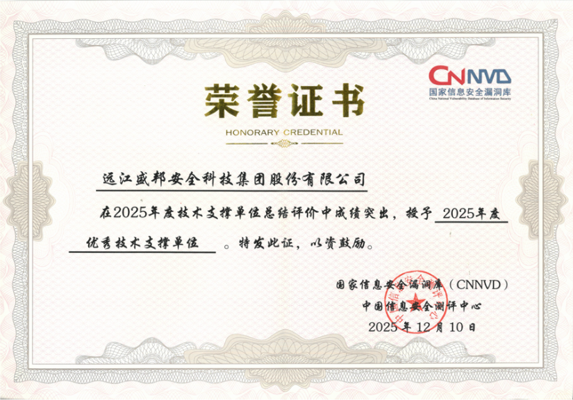 盛邦安全凭借在漏洞发现、分析与响应方面的持续深耕与卓越贡献,获评国家信息安全漏洞库(CNNVD)颁发的“2025年度优秀技术支撑单位”称号。该奖项不仅体现了国家级权威机构对盛邦安全专业技术能力的高度认可,也彰显了其在积极参与国家漏洞治理、助力提升整体安全防御水平中所发挥的重要支撑作用。