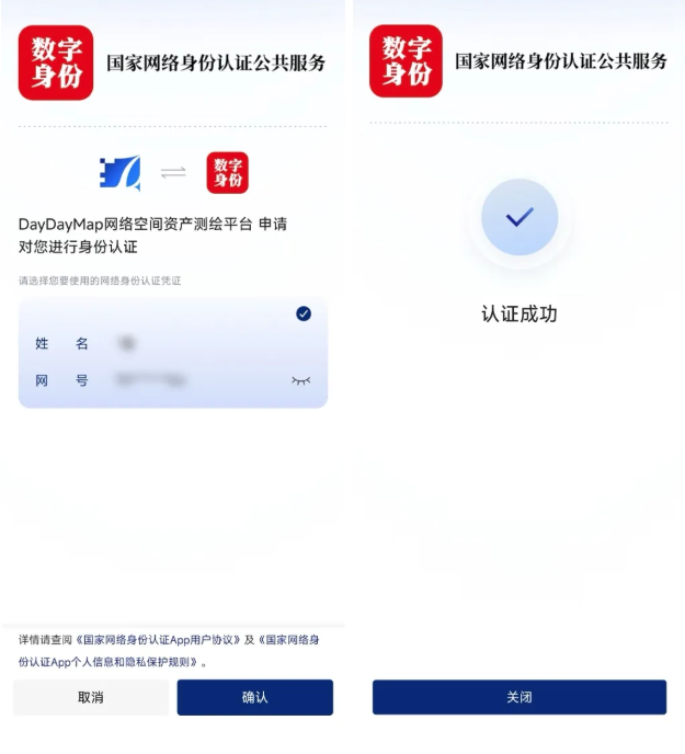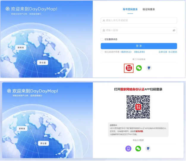 还在担忧个人身份信息泄露吗?还在为重复注册、忘记密码而烦恼吗?现在,DayDayMap携手“国家网络身份认证公共服务”,带来更安全、更可靠、更便捷的全新体验——成为国内首个支持采用“网证”注册、登录的资产测绘平台。